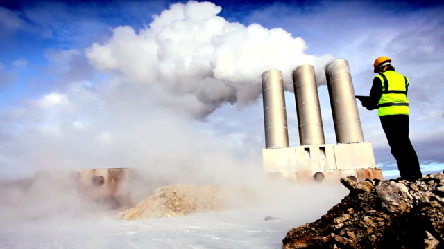 Female engineer recording data beside geothermal steam gushing from power station chimneys